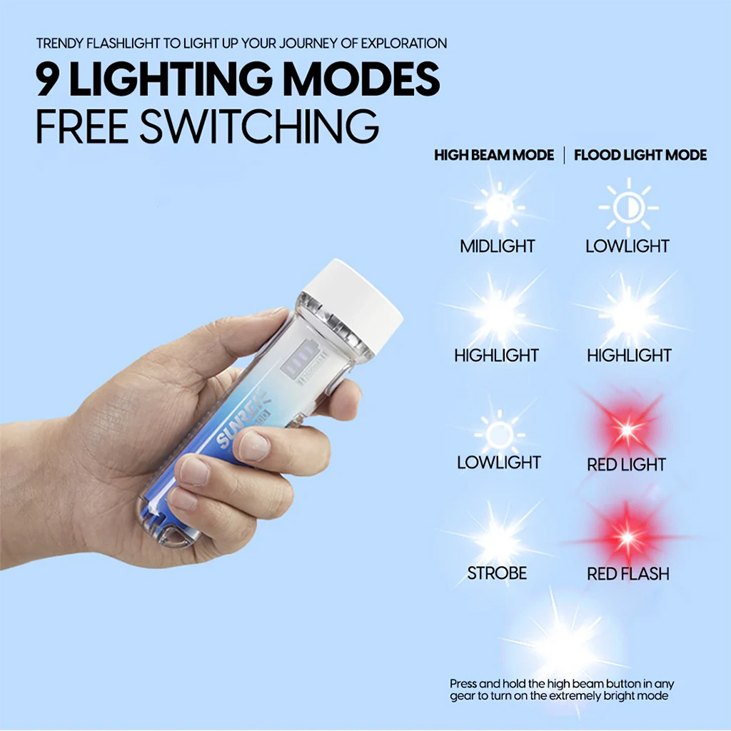 - 9 حالت نور دهی قابل تنظیم : با هر بار فشار دادن دکمه , یک حالت نور فعال می شود , نور حداقلی , نور متوسط , نور حداکثری , نور قرمز , نور سفید چشمک زن در دوحالت , نور قرمز چشمک زن در دو حالت , نور شدید لحظه ای و نور LED کناری چراغ قوه , حالت های مختلف نوردهی این چراغ قوه می باشند .
