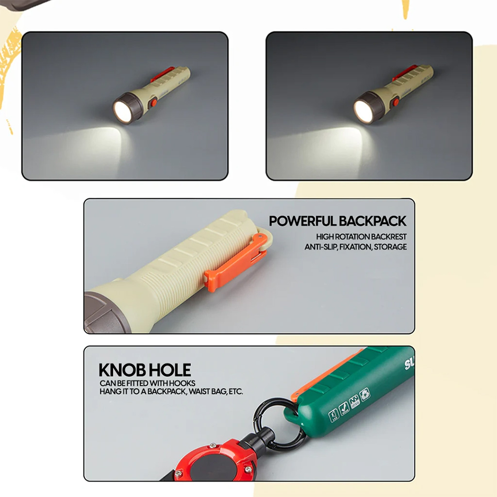 - دارای گیره جهت اتصال : در قسمت انتهایی چراغ قوه , یک عدد گیره تعبیه شده است که می توان آن را به قسمت های مختلف آویزان کرد و یا به سقف چادر متصل کرد .