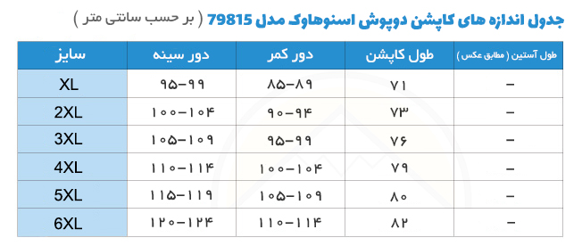 اگر به دنبال یک کاپشن گرم و ضخیم از یک برند مطمئن و با کیفیت هستید , مدل 79815 اسنوهاوک مناسب شماست , این مدل رویه ضخیم و پلار داخلی ضخیمی دارد و پلار آن حالت کبریتی دارد ( ساختار مربعی ) و همچنین در قسمت وسط سرشانه ها و بالای کمر یک لایه عایق حراراتی نیز کار شده تا حداکثر بازدهی ممکن را داشته باشد . برای سفارش این کاپشن ابتدا از جدول پایین سایز خود را انتخاب کنید سپس با زدن دکمه افزودن به سبد خرید و پر کردن مشخصات , با ارسال رایگان این کاپشن را تحویل بگیرید .