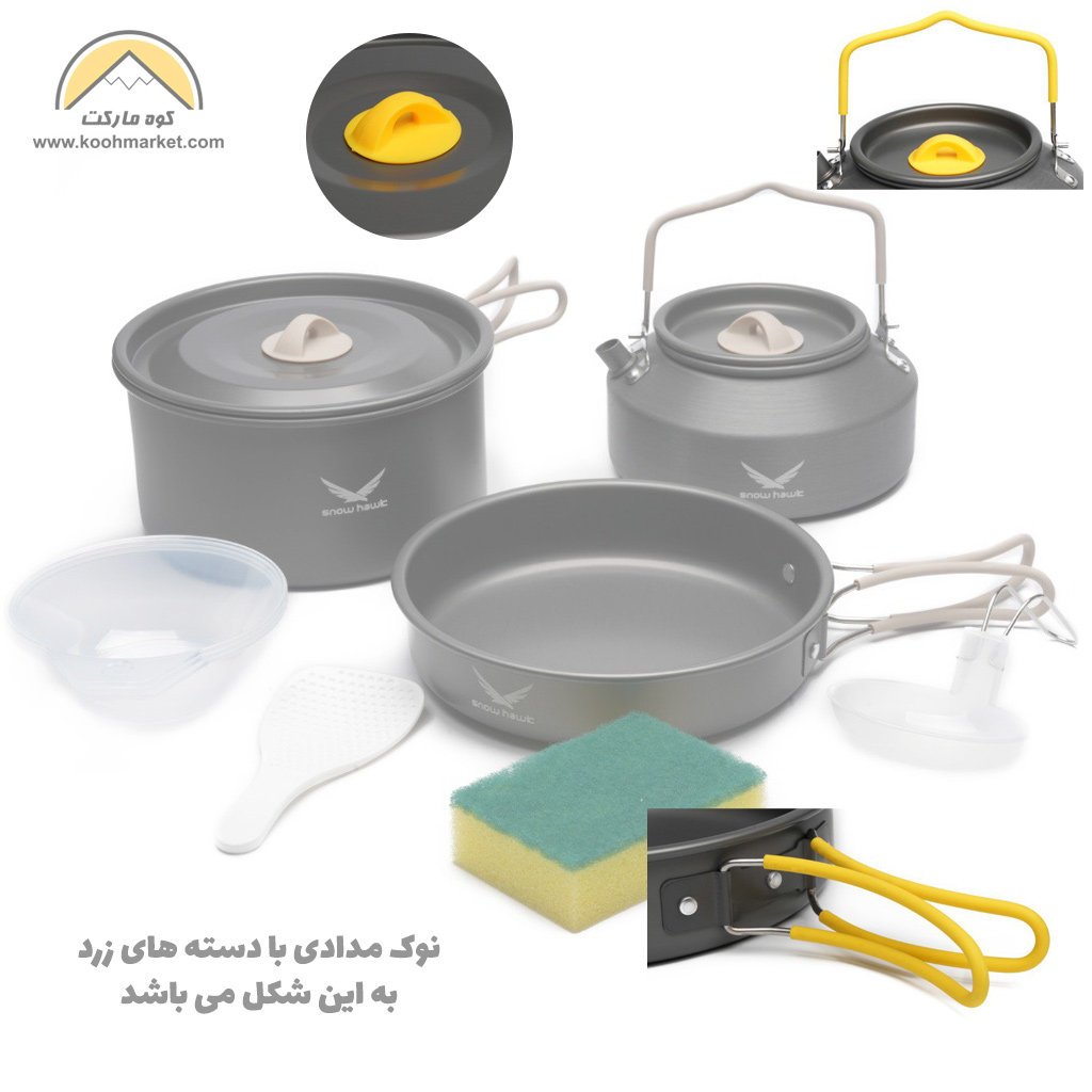| اقلام موجود در این ست | یک عدد قابلمه / درب قابلمه / یک عدد ماهیتابه / یک عدد کتری / سه عدد کاسه / یک عدد ظرف سس (قابل استفاده به عنوان ملاقه) / یک عدد کفگیر / یک عدد اسکاچ / کاور توری مخصوص حمل |